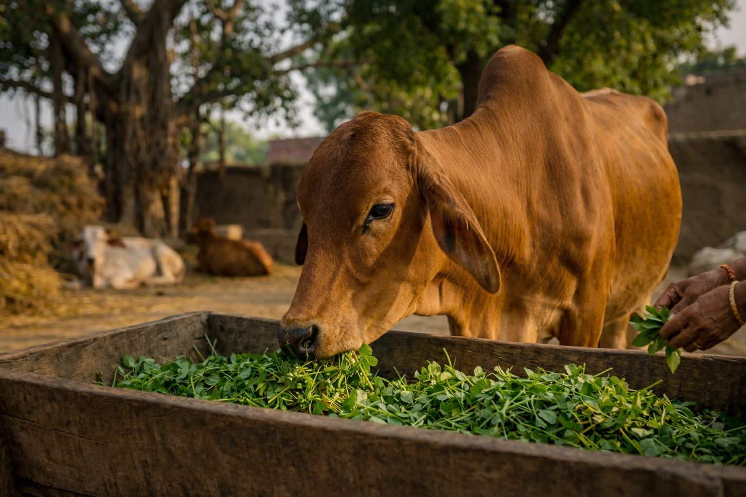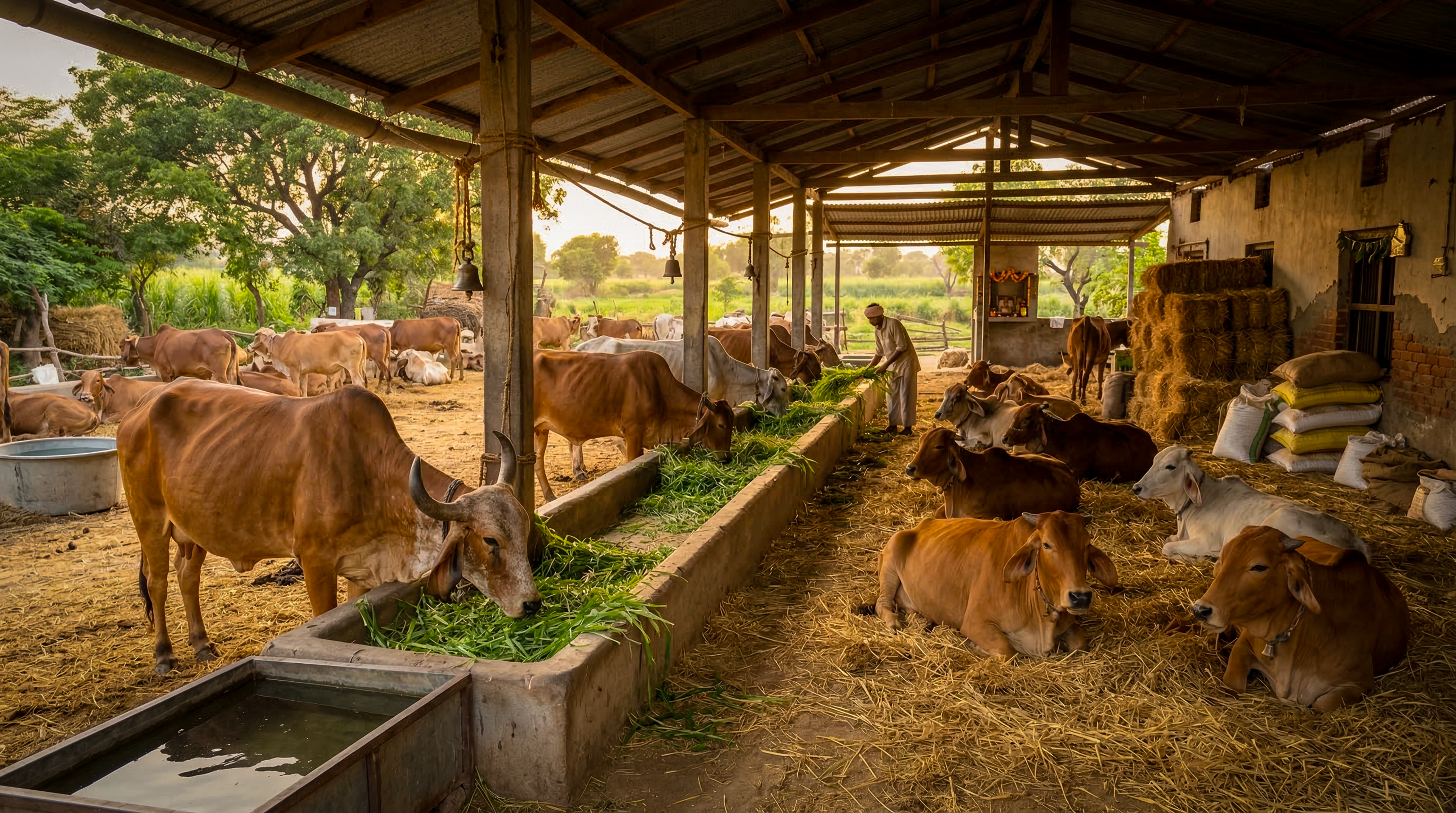 Seva contributions support green fodder, dry feed, and clean water for regular cow care.